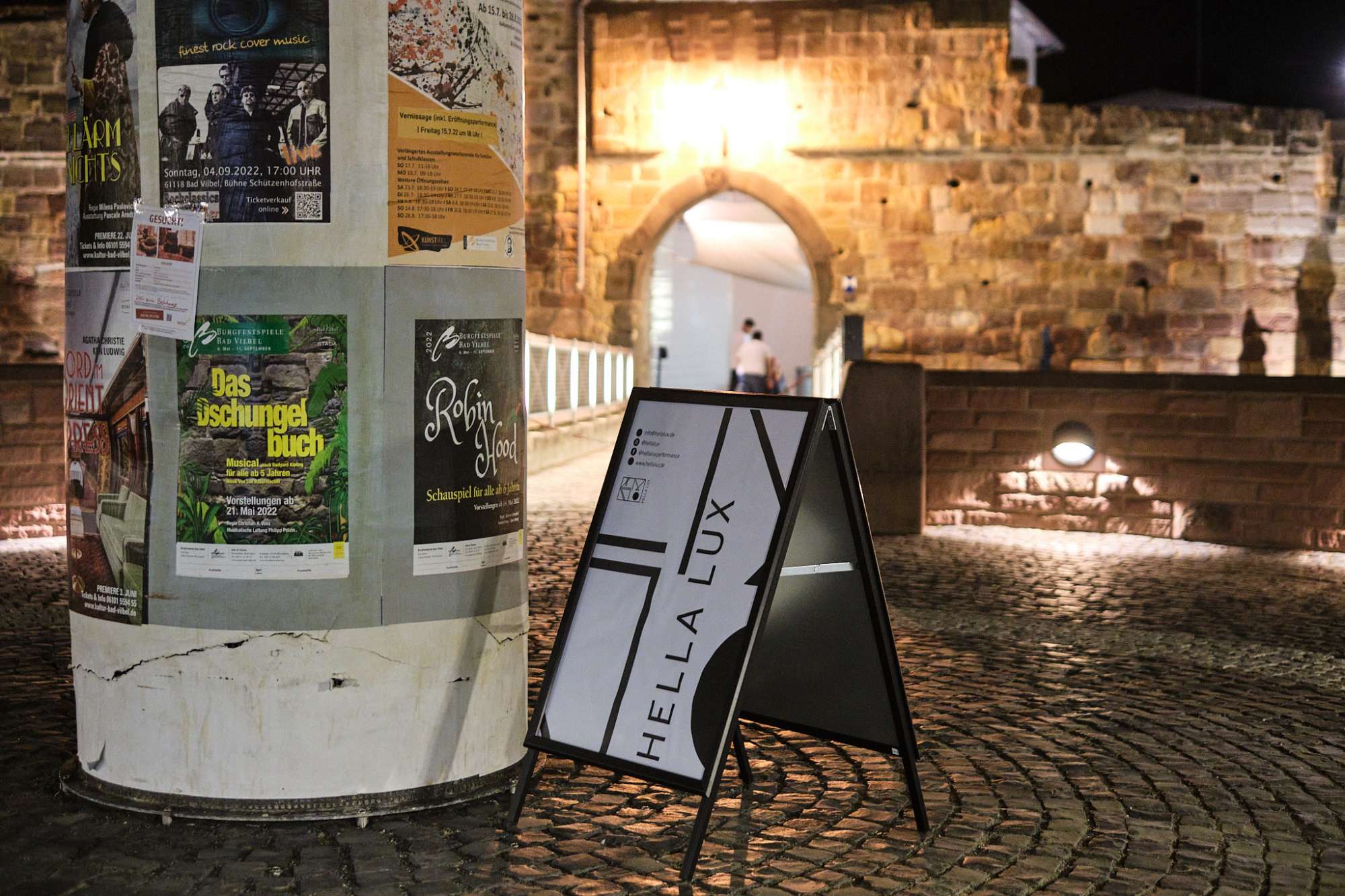 Öffentlicher Raum: “Kurz währt des Sommers Zeit” schafft ein Erlebnis, das sinnlich im öffentlichen Raum erlebt wird. Die urbane Kulisse bildet das Bühnenbild dieses kompositorischen Abendspaziergangs und wird durch Lichter und Skulpturen in Einklang mit den Sonetten gebracht. Dadurch wird eine poetische (Um-)Welt kreiert, die das Publikum zum genüsslichen Flanieren im Bad Vilber Burgpark einlädt.